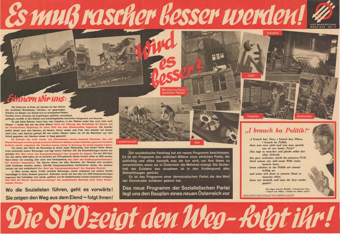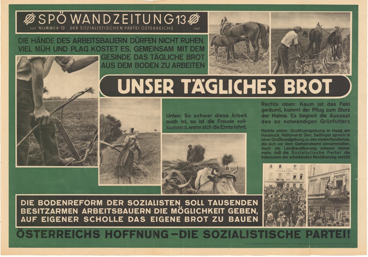 "... Unser tägliches Brot ... Die Bodenreform der Sozialisten soll Tausenden besitzarmen Arbeitsbauern die Möglichkeit geben, auf eigener Scholle das eigene Brot zu bauen Österreichs Hoffnung - die Sozialistische Partei!"