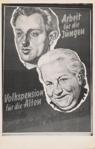 Sammlung Kunisch: Nationalratswahl 1953, Plakat der SPÖ "Arbeit für die Jungen - Volkspension für die Alten - Wählt die Sozialistische Partei Österreichs" [Porträt eines jungen Mannes und einer Pensionistin]