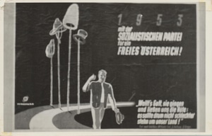 Sammlung Kunisch: Nationalratswahl 1953, Plakat der SPÖ "1953 mit der Sozialistischen Partei für ein freies Österreich! 'Wollt's Gott, sie gingen und ließen uns die Hüte: es sollte drum nicht schlechter stehen um unser Land!'...