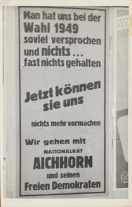 Sammlung Kunisch: Nationalratswahl 1953, Plakat der Wahlpartei Freie Demokraten "Man hat uns bei der Wahl 1949 soviel versprochen und nichts ... fast nichts gehalten. Jetzt können sie uns nichts mehr vormachen - Wir gehen mit Nat...