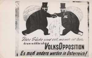 Sammlung Kunisch: Nationalratswahl 1953, Plakate der Wahlgemeinschaft Österreichische Volksopposition "Ihre Säcke sind voll, meiner ist leer - drum wähle ich Volksopposition [VO]" [zwei "Rentenklau"-Figuren der SPÖ und ÖVP ha...