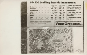 Sammlung Kunisch: Nationalratswahl 1953, zwei Plakate der Wahlgemeinschaft Österreichische Volksopposition "Für 100 Schilling hast du bekommen: [Vergleichszwahlen u. a. für Lebensmittel vom Herbst 1949 und Winter 1952/1953] (.....