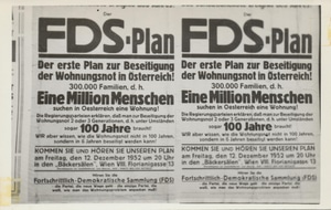 Sammlung Kunisch: Nationalratswahl 1953, Plakat der Fortschrittlich-Demokratischen Sammlung (FDS) "Der FDS-Plan - Der erste Plan zur Beseitigung der Wohnungsnot in Österreich! (...) Eine Million Menschen suchen in Österreich ein...