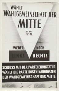 Sammlung Kunisch: Nationalratswahl 1953, Plakat der Überparteilichen Einigung der Mitte "Wählt Wahlgemeinschaft der Mitte - weder links noch rechts - Schluss mit der Parteiendiktatur - Wählt die parteilosen Kandidaten der Wahlg...