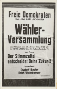 Sammlung Kunisch, Nationalratswahl 1953, Plakat der Wahlpartei Freie Demokraten "Freie Demokraten Nat.-Rat. Karl Aichhorn - Wähler-Versammlung am Mittwoch 28. Jänner 1953 19:30 Uhr im Hotel Union, Wien IX, Nußdorferstraße 25 z...