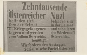 Sammlung Kunisch, Nationalratswahl 1945, Plakat der SPÖ "Zehntausende Österreicher befinden sich fern der Heimat in Kriegsgefangenenlagern und werden zum Aufbau Österreichs benötigt. Zehntausende Nazi befinden sich in der Heim...