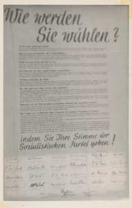Sammlung Kunisch: Nationalratswahl 1953, Plakat der SPÖ "Wie werden Sie wählen? (...) indem Sie Ihre Stimme der Sozialistischen Partei geben!" [viel unleserlicher Text dazwischen, darunter eine Abbildung zahlreicher Unterschrift...