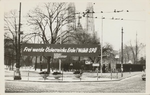 Sammlung Kunisch: Nationalratswahl 1953, Plakat der SPÖ "Frei werde Österreichs Erde! Wählt SPÖ (...)" - am Schottentor, Votivkirche im Hintergrund