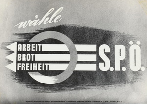 Sammlung Kunisch: Nationalratswahl 1953, Plakat der SPÖ "Wähle Arbeit, Brot, Freiheit - S.P.Ö." [Kreis mit drei Pfeilen, auf jedem Pfeil steht einer der Begriffe]