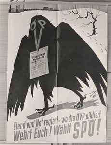Sammlung Kunisch: Nationalratswahl 1953, Plakat der SPÖ "Elend und Not regiert - wo die ÖVP diktiert - Wehrt Euch! Wählt SPÖ!" [die ÖVP als schwarzer Rabe oder Krähe mit einer Arbeitslosen-Meldekarte im Schnabel]