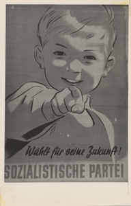 Sammlung Kunisch: Nationalratswahl 1953, Plakat der SPÖ "Wählt für seine Zukunft! Sozialistische Partei" [ein kleiner Junge zeigt mit seinem Zeigefinger auf die/den Betrachter/in]