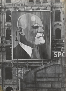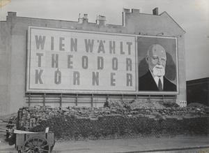 Sammlung Kunisch: Bundespräsidentschaftswahl 1951, Wechselplakatgerüst der SPÖ, großes Porträtbild Theodor Körners, davor Ruinenwand mit Graffiti "Wählt SPÖ", PassantInnen - Rennweg