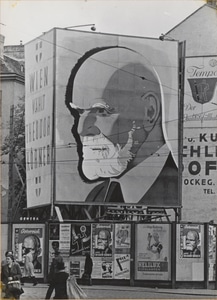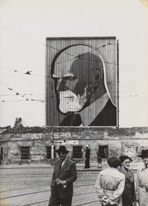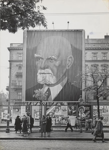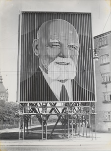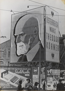Sammlung Kunisch: Bundespräsidentschaftswahl 1951, Wechselplakatgerüst der SPÖ, großes Porträtbild Theodor Körners am Schwedenplatz