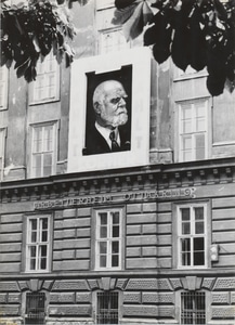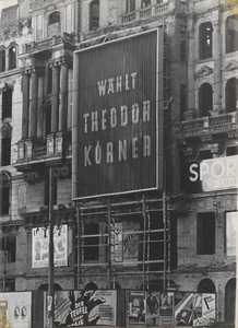 Sammlung Kunisch: Bundespräsidentschaftswahl 1951, großes Porträtbild Theodor Körners am Arbeiterheim Ottakring "Wählt Körner"