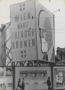 Sammlung Kunisch: Bundespräsidentschaftswahl 1951, Wechselplakatgerüst der SPÖ "Wien wählt Theodor Körner - Theodor Körner - Der Mann der Tat", darunter Gewista-Plakatwand u.a. "Österreich wählt Theodor Körner", davor Pas...
