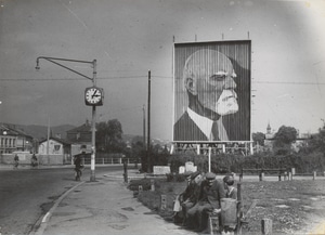 Sammlung Kunisch: Bundespräsidentschaftswahl 1951, Wechselplakatgerüst der SPÖ, großes Porträtbild Theodor Körners in Purkersdorf, davor Pensionisten, Würfeluhr