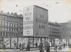 Sammlung Kunisch: Bundespräsidentschaftswahl 1951, Wechselplakatgerüst der SPÖ "Wählt Theodor Körner", davor Gewista-Plakatwand - Schwedenplatz
