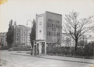 Sammlung Kunisch: Bundespräsidentschaftswahl 1951, Wechselplakatgerüst der SPÖ "Wählt den General des Friedens" - dahinter Gemeindebauten, Friedrich-Engels-Platz, Brigittenau