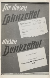 Sammlung Kunisch: Nationalratswahl 1953, Plakat der Wahlgemeinschaft Österreichische Volksopposition "Für diesen Lohnzettel [Abrechnung für Franz Gruber (...) Nettolohn: 273,45 Schilling] diesen Denkzettel: Nationalratswahl Wah...
