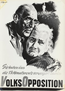 Sammlung Kunisch: Nationalratswahl 1953, Plakat der Wahlgemeinschaft Österreichische Volksopposition "Sie haben uns die 13. Monatsrente verweigert - darum Volksopposition" [ein Pensionistenpaar umarmt sich sorgenvoll vor einem Ch...