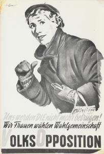 Sammlung Kunisch: Nationalratswahl 1953, Plakat der Wahlgemeinschaft Österreichische Volksopposition "Uns werden DIE nicht mehr betrügen! Wir Frauen wählen Wahlgemeinschaft Volksopposition [VO]" [Darstellung einer Frau, die mit...