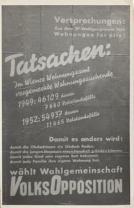Sammlung Kunisch: Nationalratswahl 1953, Plakat der Wahlgemeinschaft Österreichische Volksopposition "Versprechen: Aus dem SP-Wahlprogramm 1949 - Wohnungen für alle! Tatsachen: Im Wiener Wohnungsamt vorgemerkte Wohnungssuchende ...