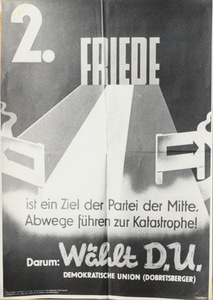 Sammlung Kunisch: Nationalratswahl 1949, Plakate der D.U. "2. Friede ist ein Ziel der Partei der Mitte, Abwege führen zur Katastrophe! Darum: Wählt D.U. - Demokratische Union (Dobretsberger)" [bei Kunisch 1953 eingeordnet]