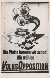 Sammlung Kunisch: Nationalratswahl 1953, Plakat der Wahlgemeinschaft Österreichische Volksopposition "Die Platte kennen wir schon! Wir wählen Volksopposition" [ein Grammophon, es "ertönen" die Gesichter der Spitzenpolitiker von...