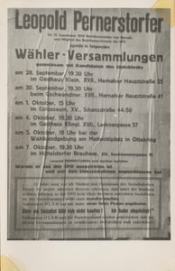 Sammlung Kunisch: Nationalratswahl 1949, Plakat der KPÖ und Linkssozialisten "Leopold Pernerstorfer [...] spricht in folgenden Wähler-Versammlungen gemeinsam mit Kandidaten des Linksblocks [...] Warum er aus der SPÖ ausgetreten...