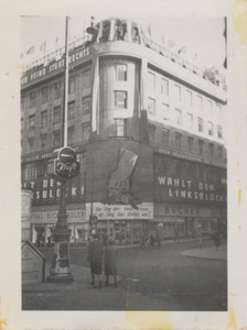 Sammlung Kunisch: Nationalratswahl 1949, große Werbeflächen der KPÖ und Linkssozialisten auf dem Gebäude der Zentralbuchhandlung, davor Passantinnen, "Der Sieg des Linksblocks wird der Sieg des Volkes sein!" [ eine Faust drüc...