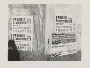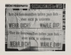 Sammlung Kunisch: Nationalratswahl 1949, zwei Plakate der ÖVP an einem Häusereck, davor Passant, "FREIHEIT oder Stacheldraht? Wehrt Euch! Wählt: Österreichische Volkspartei" "60 km von Wien! [...] Wehr dich! Wähle: Österreic...