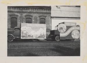 Sammlung Kunisch: Nationalratswahl 1949, Werbung (vermutlich SPÖ] auf einem LKW mit Anhänger "Leicht erreichbare Sportplätze für alle Werktätigen!" [Fußballtormann vor einem Stadtplan Wiens] "Gesicherte Währung" - Werbung a...
