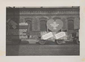 Sammlung Kunisch: Nationalratswahl 1949, Werbung (vermutlich SPÖ] auf einem LKW mit Anhänger "[Wähle] sozialistisch" / "Alle roten Herzen stimmen für uns" ["Kindergärten" "Ferienheime"]