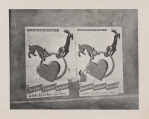 Sammlung Kunisch: Nationalratswahl 1949, Plakat der SPÖ "SPÖ-Nachrichten Nr. 11 - Friede - Freiheit - Fortschritt - wählt Sozialistische Partei" [ein KPÖ- und ÖVP-Hund nagen am roten Kreis der drei Pfeile, sozialistisches Her...