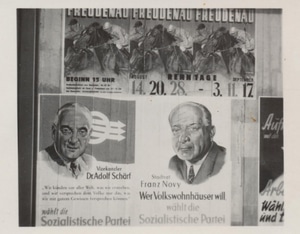 Sammlung Kunisch: Nationalratswahl 1949, Häuserwand mit Plakaten der SPÖ und Pferderennen in der Freudenau "Vizekanzler Dr. Adolf Schärf [...] wählt die Sozialistische Partei" "Stadtrat Franz Novy Wer Volkswohnhäuser will wÃ...