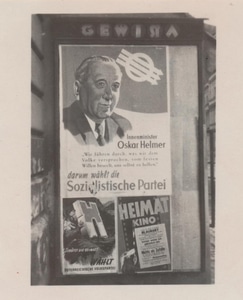 Sammlung Kunisch: Nationalratswahl 1949, Gewista-Plakatwand mit Plakaten der SPÖ, ÖVP und des "Heimat-Kino". "Innenminister Oskar Helmer [...] darum wählt die Sozialistische Partei" / "Schütz die Heimat! Wählt Österreichsich...