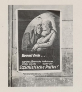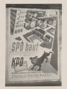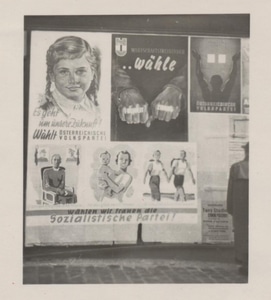 Sammlung Kunisch: Nationalratswahl 1949, Häuserwand mit Plakaten der SPÖ "Arbeit - Brot - Freiheit" "SO oder SO - Für gesundes Wohnen!" [Zinskaserne vs. Gemeindebau] "So oder so [...] Komm zur Sozialistischen Partei" [Arbeiterf...