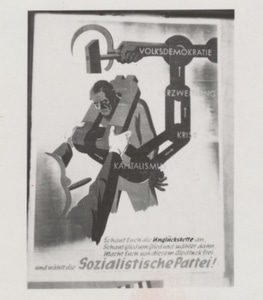 Sammlung Kunisch: Nationalratswahl 1949, Plakat der SPÖ "Kapitalismus - Krise - Verzweiflung - Volksdemokratie - Schaut Euch die Unglückskette an, schaut euch Glied um Glied und wählet dann. Macht euch von diesem Alpdruck frei ...