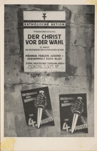 Sammlung Kunisch: Nationalratswahl 1949, Plakate der ÖVP "Pfarrkundgebung - Der Christ vor der Wahl. es spricht ein Delegierter der Katholischen Aktion. Männer, Frauen, Jugend - versammelt euch alle! Pfarre Maria Rotunda", darun...
