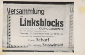 Sammlung Kunisch: Nationalratswahl 1949, Plakat der KPÖ und Linkssozialisten "Versammlung des Linksblocks im Kasino Zögernitz [20. September 1949 [...] mit Erwin Scharf und Dr. Ludwig Soswinksi" Darunter Plakat des VdU "Für Rec...