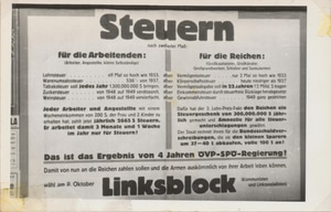 Sammlung Kunisch: Nationalratswahl 1949, Plakat der KPÖ und Linkssozialisten "Steuern nach zweierlei Maß: für die Arbeitenden - für die Reichen [...] Das ist das Ergebnis von 4 Jahren ÖVP-SPÖ-Regierung! [...] wähl am 9. Okt...