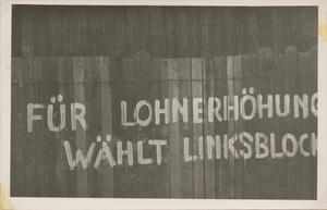 Sammlung Kunisch: Nationalratswahl 1949, Graffiti auf Bretterverschlag der KPÖ und Linkssozialisten "Für Lohnerhöhung wählt Linksblock"