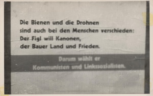 Sammlung Kunisch: Nationalratswahl 1949, Plakat der KPÖ und Linkssozialisten "Die Bienen und die Drohnen sind auch bei den Menschen verschieden: Der Figl will Kanonen, der Bauer Land und Frieden. Darum wählt er Kommunisten und L...