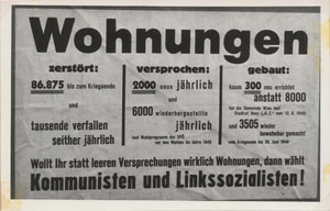 Sammlung Kunisch: Nationalratswahl 1949, Plakat der KPÖ und Linkssozialisten "Wohnungen zerstört - versprochen - gebaut [...]Wollt Ihr statt leeren Versprechungen wirklich Wohnungen, dann wählt Kommunisten und Linkssozialisten!...