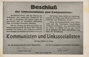 Sammlung Kunisch: Nationalratswahl 1949, Plakat der KPÖ und Linkssozialisten "Beschluß der Linkssozialisten und Kommunisten [...] mit einer einheitlichen Liste [...] vor die Wähler zu treten" Daneben: Plakat "Wahlprogramm der S...