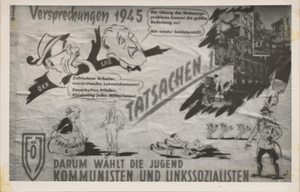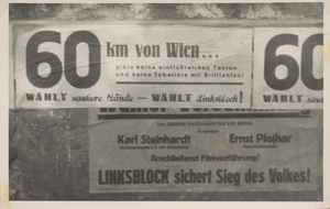 Sammlung Kunisch: Nationalratswahl 1949, Plakat der KPÖ und Linkssozialisten "60 km von Wien... gibt’s keine einflußreichen Tanten und keine Tabatiere mit Brillanten! WÄHLT saubere Hände - WÄHLT Linksblock!" darunter Plakat...