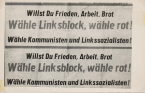 Sammlung Kunisch: Nationalratswahl 1949, Plakat der KPÖ und Linkssozialisten "Willst du Frieden, Arbeit, Brot - Wähle Linksblock, wähle rot! Wähle Kommunisten und Linkssozialisten!"