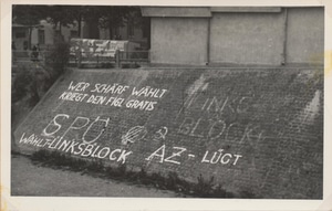 Sammlung Kunisch: Nationalratswahl 1949,Wandgraffiti der KPÖ und Linkssozialisten "Wer Schärf wählt kriegt den Figl gratis - Wählt Linksblock / AZ - Lügt"