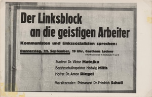 Sammlung Kunisch: Nationalratswahl 1949, Plakat der KPÖ und Linkssozialisten "Der Linksblock an die geistigen Arbeiter - Kommunisten und Linkssozialisten sprechen: Donnerstag 22. September 19 Uhr, Gasthaus Ladner [...] Stadtrat D...