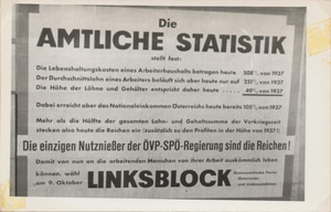 Sammlung Kunisch: Nationalratswahl 1949, Plakat der KPÖ und Linkssozialisten "Die amtliche Statistik stellt fest: Die Lebenshaltungskosten eines Arbeiterhaushalts betragen heute 508 % von 1937 [...] Die einzigen Nutznießer der Ã...